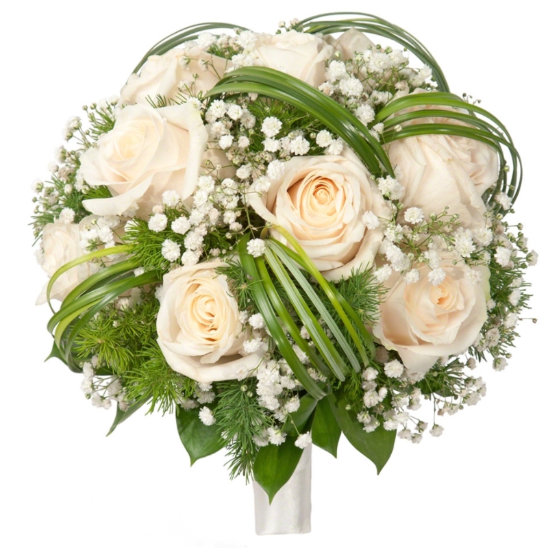 Букет состоит из 11 кремовых роз, берграсс, 5 гипсофила, зелень, лента.