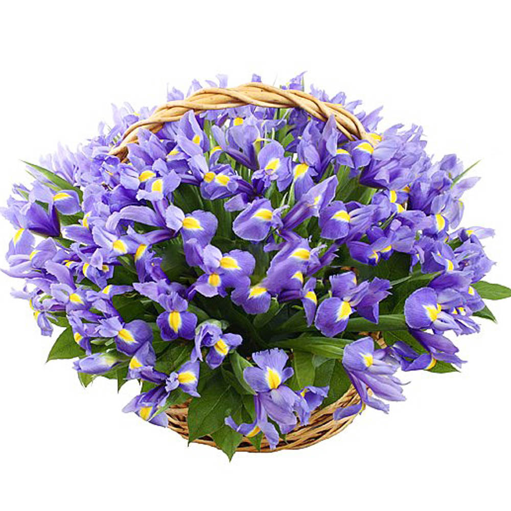 Букет состоит из 75 ирисов, зелень, корзина.