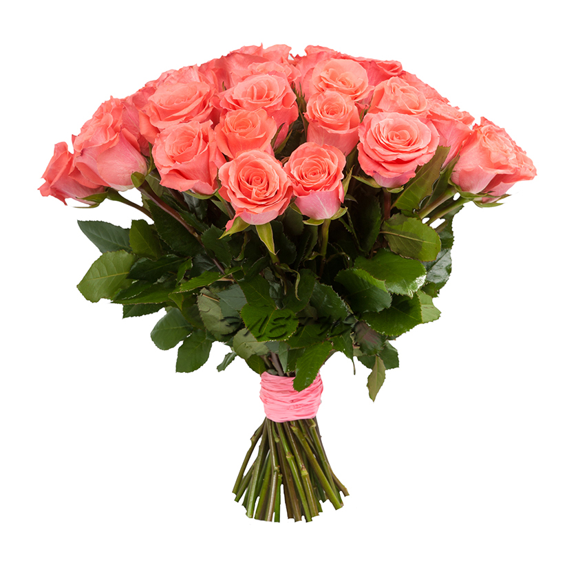 Букет состоит из 31 коралловая роза, прозрачная упаковка, атласная лента.