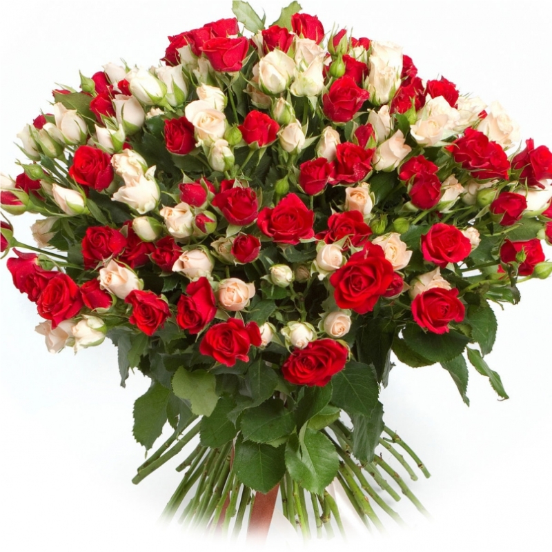Букет состоит из MIX из 51 красной и белой розы, прозрачная упаковка, атласная лента.