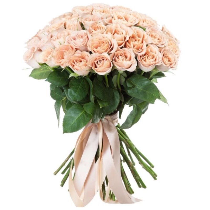 Букет состоит из 55 кремовых роз, прозрачная упаковка, атласная лента.