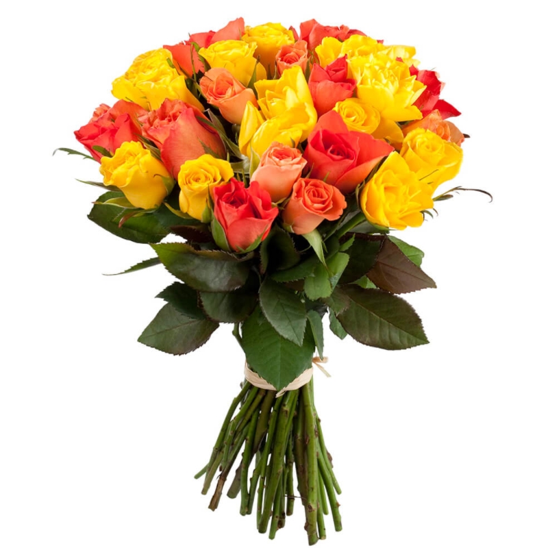 Букет состоит из 23 коралловые розы, 22 желтые розы, прозрачная упаковка, атласная лента.
